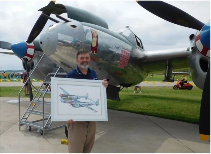 Brian Liddle: So, I do have the 24” by 28” P-38 drawing on hand as we speak and it will be photographed. Then, as soon as AirVenture is over, I will be flown up to Superior, Wisconsin by a friend of mine. So that'll be put on display. Which brings me to the future. What do I foresee in the future with my artwork? Well, I see a lot more drawings. I see commissions and I do see other drawings other than their plans, but we're going to stay aviation based right now. I see hopefully more museums in my future and my stuff on display throughout the United States; worldwide would be really nice. I will have one of my prints in Israel. I'm not sure in what city, but I did sell a print to a couple of Israeli gentlemen, and they are going to take it to a city near Tel Aviv. I do have some more artwork in Romania and across the border, I have a few pieces in Canada. But my goal is to keep making connections with museums and with important people, I mean, all of you are important. I wouldn't be doing this if it wasn't for the history and people like you. If it wasn't for those foreign wars, I wouldn't have anything to research or draw? And then there's the commercial airlines and the recreational aircraft. I'm happy to draw them, too. So, without people, without communication, without friendship and fellowship, I wouldn't be drawing.