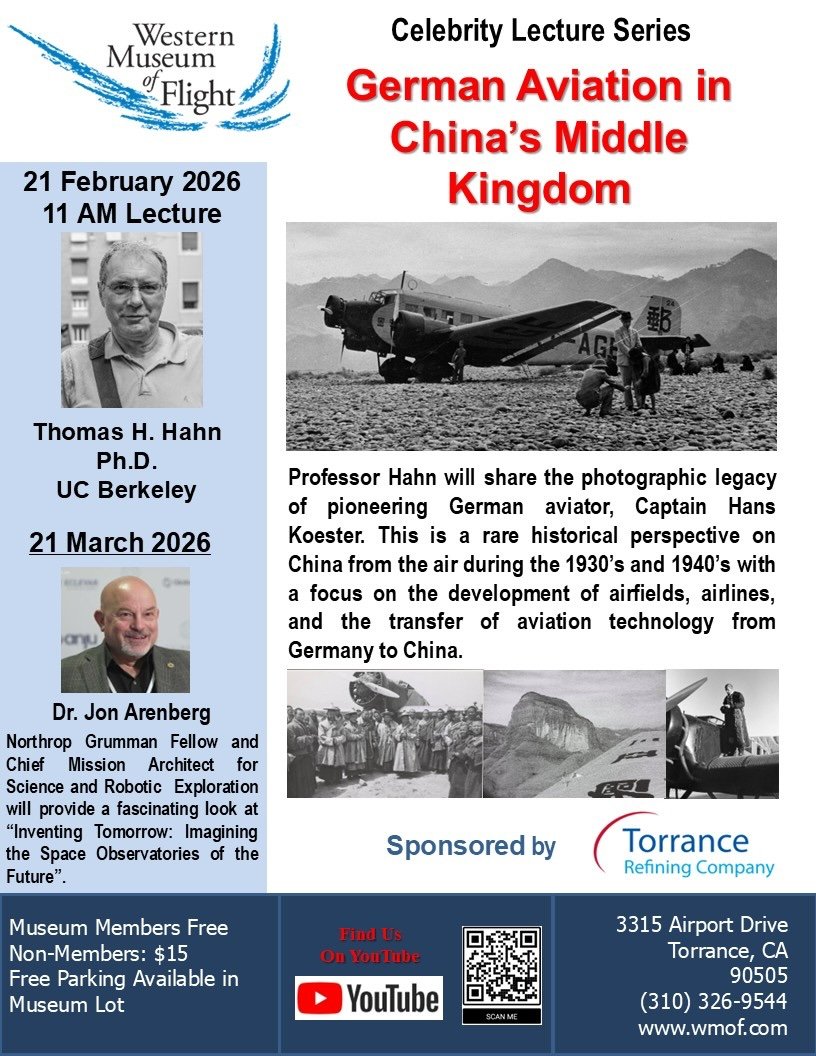 Join the Western Museum of Flight for a rare historical presentation exploring German Aviation in China’s Middle Kingdom. Professor Thomas H. Hahn, Ph.D. (UC Berkeley) will share the remarkable photographic legacy of pioneering German aviator Captain Hans Koester, offering a unique aerial perspective of China during the 1930s and 1940s.